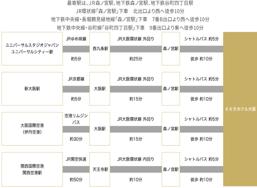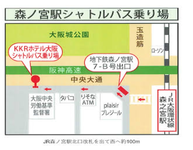 交通案内:JR森ノ宮駅北口改札を出て、西100m大阪中央労働基準監督署前にKKRホテル大阪シャトルバスが15分毎に巡回。無料。バス乗り場からホテルまで5分。